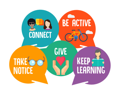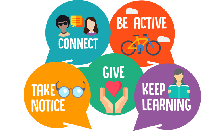 The Five Ways to Wellbeing, a UK government initiative, identifies five evidence-based actions to promote mental health and well-being: connecting (social relations), being active (movement), taking notice (awareness), keep learning (growth and mastery), and giving (prosocial behaviour). These actions are applicable to all ages.